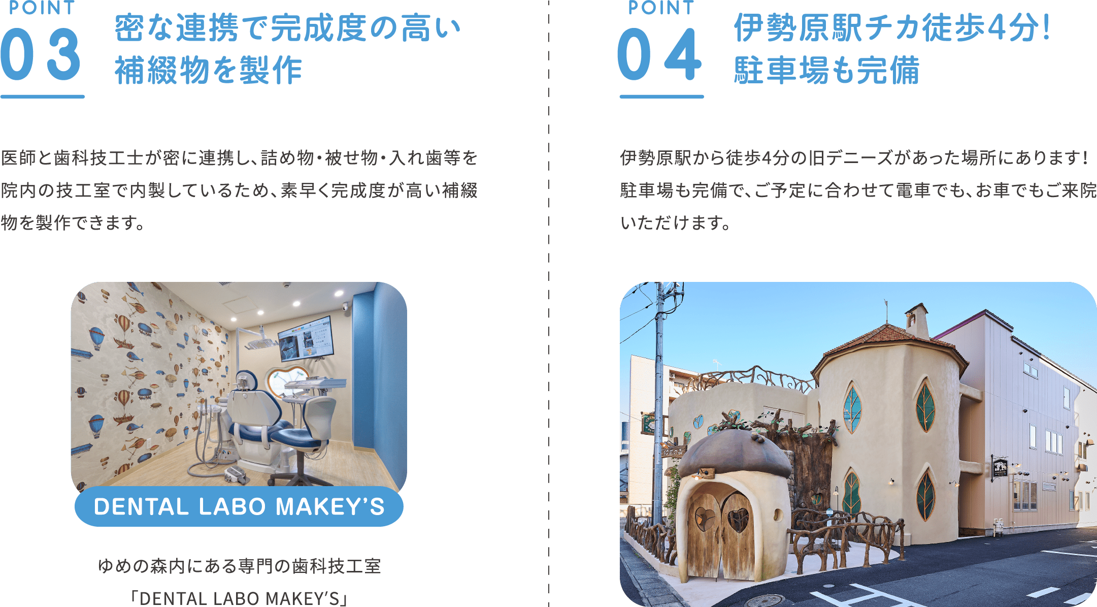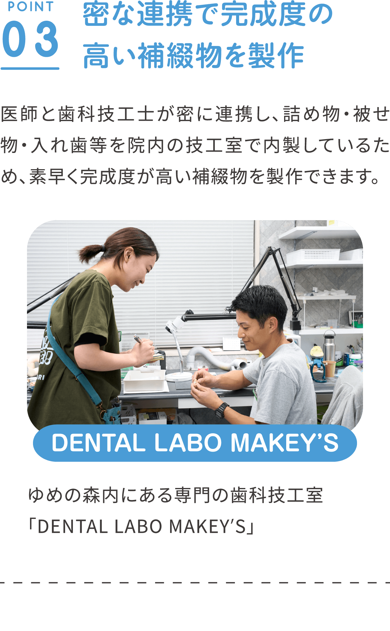 医療法人よつ葉会では、「ゆめの森歯科」の患者さまに、より高品質でスピーディなサービスがおこなえるよう、院内ラボ(技工室)を完備しています。院内ラボとは、歯科治療で必要な詰め物・かぶせ物・入れ歯等の補綴物を製作する技工室のことです。一般的な歯科医院の場合、こうした補綴物は専門業者に外注するところがほとんどなのですが、医療法人よつ葉会では院内で製作しています。内製することで、歯型や設計図の送付、また外注先からの完成品の送付にかかる時間が不要になります。つまり患者さまの治療にかかる時間を大幅に短縮することができます。また、医師と歯科技工士の連携がしっかりおこなわれているため、より完成度の高い補綴物を製作することが可能になります。