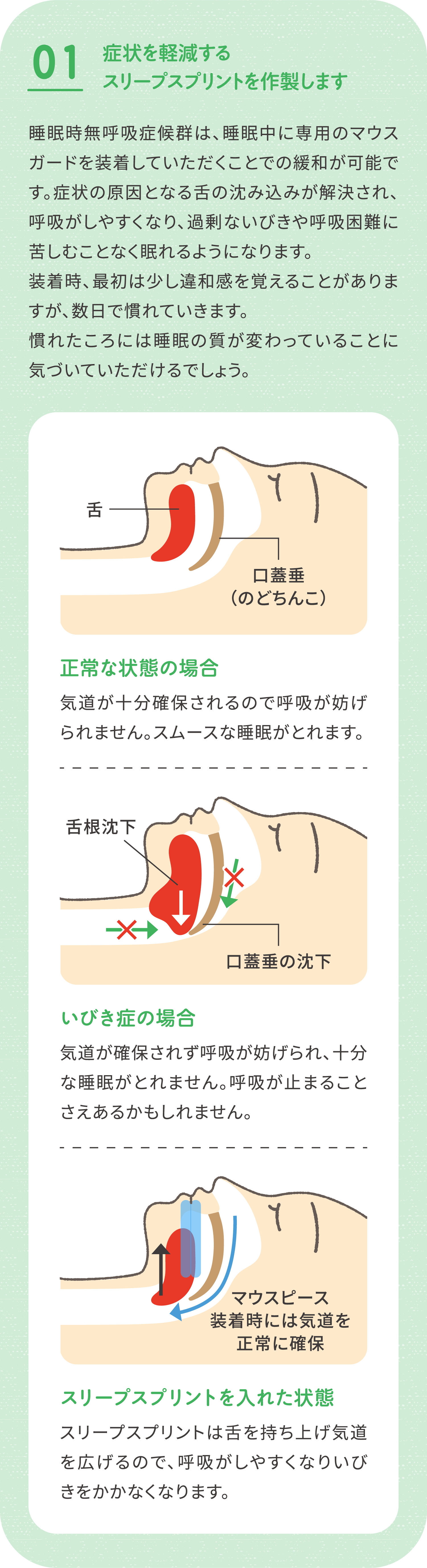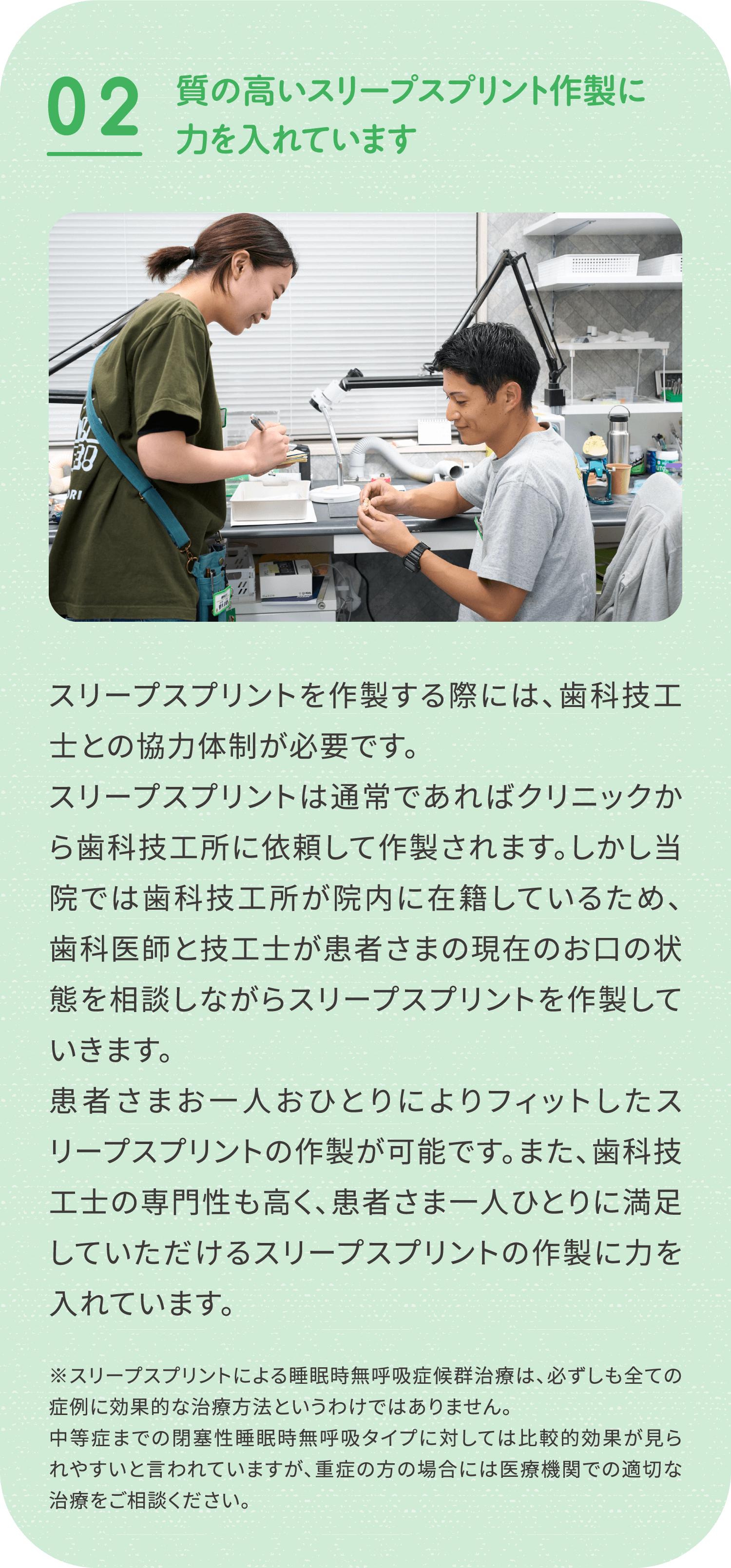 歯科医師と技工士とで強く連携し、患者さま一人ひとりが睡眠の質と健康状態、日中の活動をより良くできるように努めます。