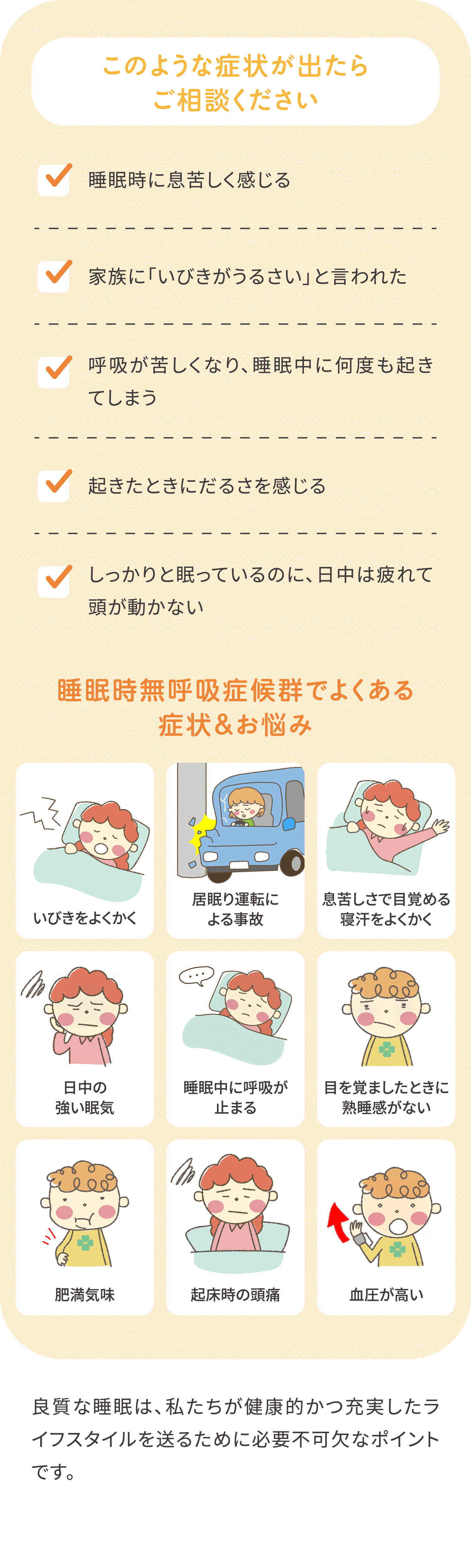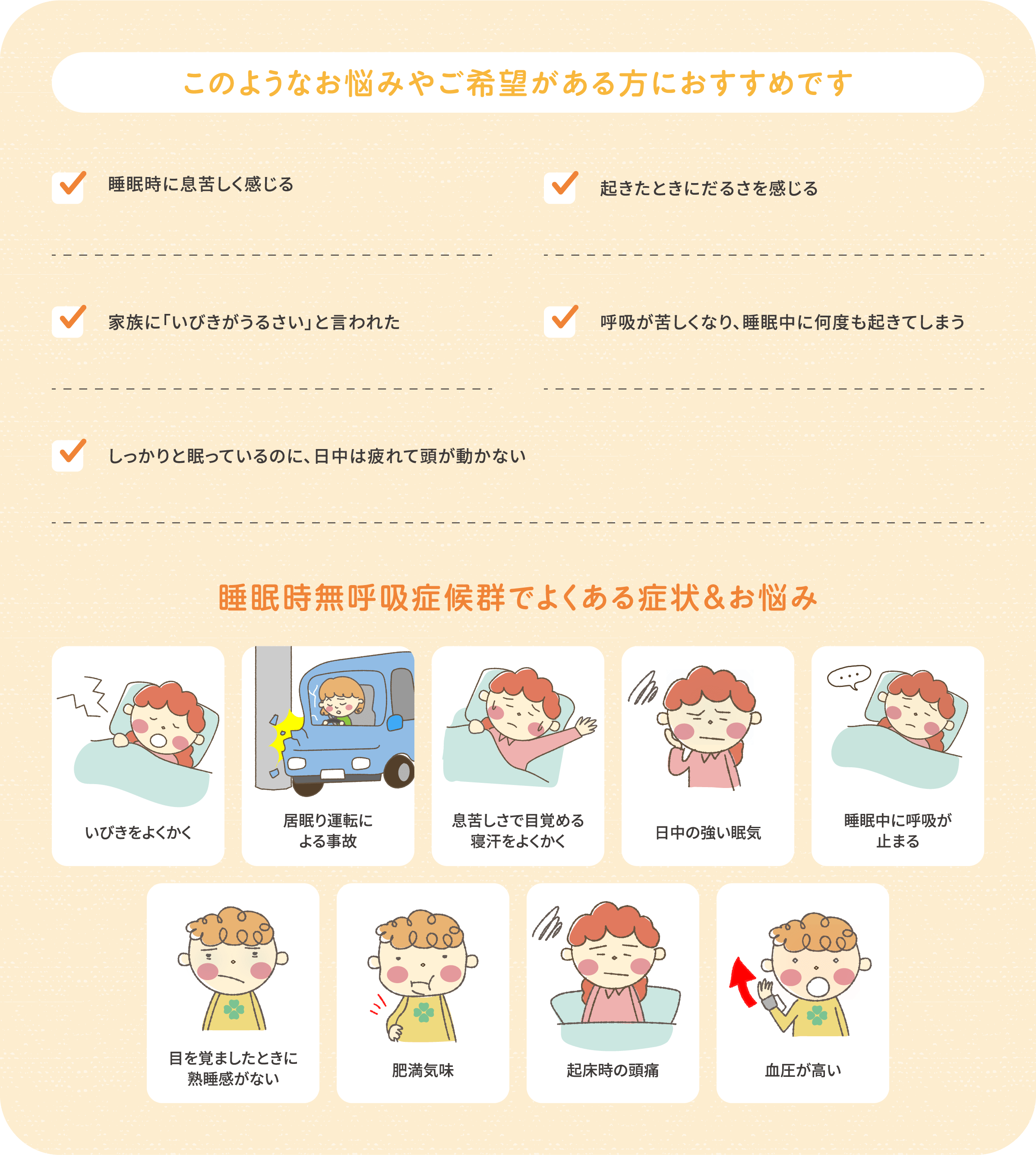 「睡眠中に息苦しい感じがする」「家族のいびきが不自然なほどにうるさく感じる」というサインに気づいたら、まずはお気軽にご相談ください。