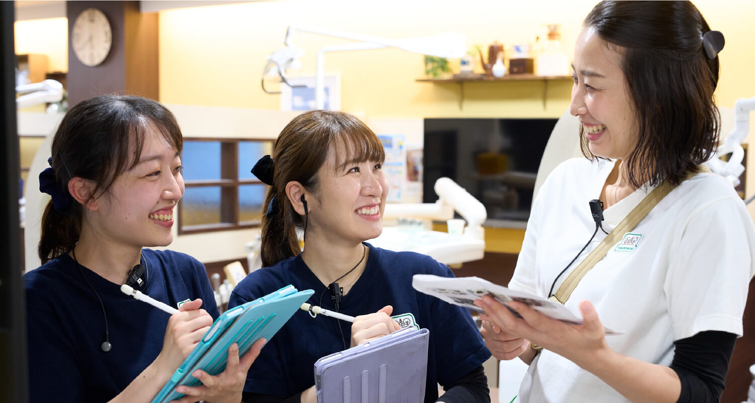 当院では、いっしょに夢を叶えるスタッフを募集しています。当院には小さなお子さまからご年配の方まで、様々な患者さまがいらっしゃいます。ご自身で来られない方にはこちらからお伺いして診療にあたっています。私たちは、すべての患者さまの歯の健康を守るために、最高の技術と笑顔で日々お仕事に取り組んでいます。皆さまに健康で幸せになっていただく。そして私たちスタッフ全員も明るく健康で幸せになる。それが当院で働くみんなの目的です。歯科医療というお仕事を通して患者さまの健康に貢献し、日々スキルを磨いて人間的にも成長していく。そんな充実した働き方ができるように、独自の教育システムとチームワークであなたをバックアップします。「人さまのお役に立てることで自らも人として成長できる」そんな愛のある素敵な働き方のできる「ゆめの森歯科いせはら」であなたもいっしょに夢を叶えませんか?
